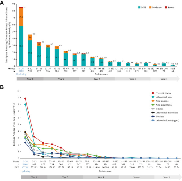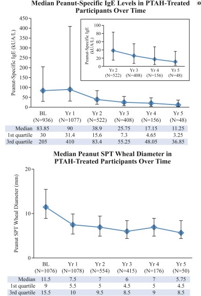 Gastrointestinal symptoms were the most commonly reported treatment-related AEs. A downward trend in systemic allergic reactions was also reported. PTAH treatment resulted in reduced levels of peanut-specific IgE after the first year and increased levels of peanut-specific IgG4, with a lowered peanut-specific IgE:IgG4 ratio. A reduction in median peanut skin prick test wheal diameter was observed (11.50 mm at baseline vs 5.75 mm at year 5). Unpublished draft is available here.